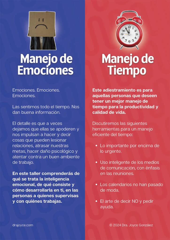Los talleres son SUMAMENTE INTERACTIVOS, combinarán diversas técnicas de aprendizaje, tales como: presentación, videos, lecturas breves, análisis y discusión de casos, role playing, tareas breves para aplicar en el trabajo, assessments, ejercicios individuales y grupales, entre otras.